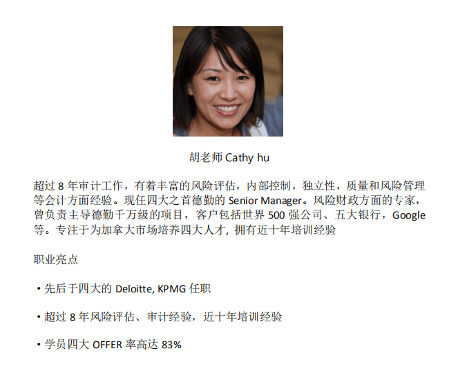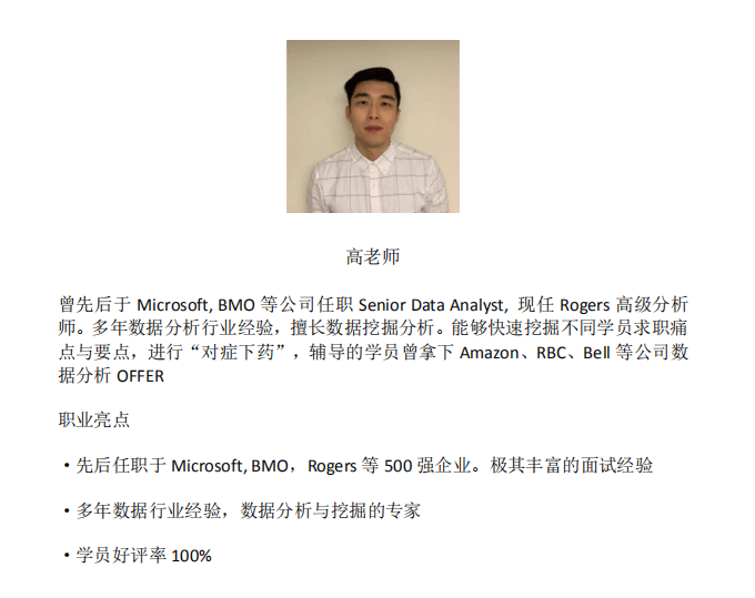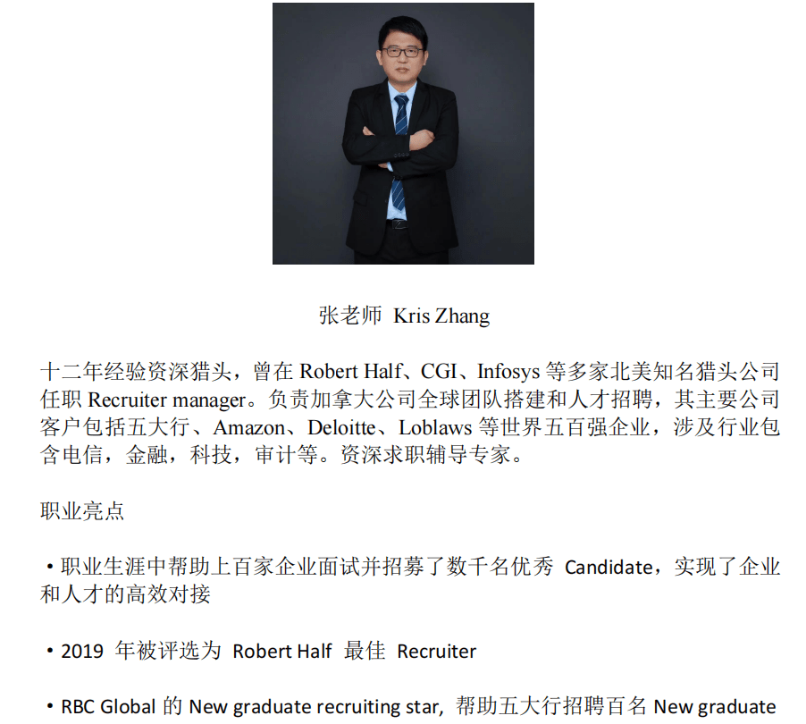 - 帮助学员修改简历,提升口语表达、networking、面试技巧等方面求职素养,辅导学员面试,帮助学员在求职中脱颖而出